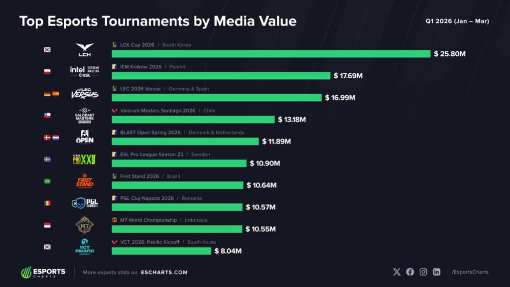 El primer trimestre de 2026 ha dejado una lectura interesante sobre el negocio de los esports: Counter-Strike 2 mantiene su presencia constante en los rankings globales, pero el evento con mayor “valor mediático” del periodo no fue un Major internacional, sino un torneo regional de Corea. Según el informe de Esports Charts publicado el 7 de abril, LCK Cup 2026 encabezó la clasificación mundial de Q1 con un media value estimado de 25,8 millones de dólares, siendo el único evento del trimestre que superó la barrera de los 20 millones.